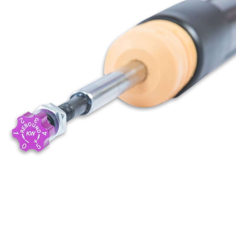 KW V2 INOX-LINE coilovers are the perfect solution for drivers who want more than just outstanding looks and adjustable ride height. In addition to stainless steel coilover struts, and corrosion-resistant components built for long term durability, KW V2 coilovers utilize TVR-A (Twin Valve Rebound - Adjustable) technology that allow Adjustment of the rebound damping characteristics with 16 clicks so you can fine tune the ride comfort or performance to your satisfaction. As with all KW coilovers our engineers develop vehicle specific damper settings that undergo comprehensive testing on the Nurburgring Nordschleife and in our KW 7-post Driving Dynamic Test Center. With a KW coilover kit the driving experience is more dynamic and direct. With the rebound adjustability you have a more direct influence on the handling or comfort of the car. With 16 precise clicks you can adjust the KW dampers (more firm or more comfortable) without affecting the compression damping fine-tuned by our engineers. The two-stage, patented TVR-A (Twin Valve Rebound - Adjustable) technology enables a small volume of oil flow through an adjustable, conically shaped, low-speed bypass during low damper speeds, while at high damper speeds, the main rebound stage valve opens allowing a larger volume of oil to flow. This provides a big improvement in terms of ride comfort without influencing the high-speed range. There are 16 precise clicks available for individual settings, so you can choose between more comfort or more body control. With KW V2 coilovers you can achieve maximum lowering within an approved lowering range that ensures a proper functioning suspension and adequate travel after your car is lowered. Even after years of use you can easily adjust the ride height thanks to the dirt resistant trapezoid thread and composite adjustment collar.